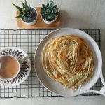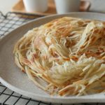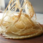 Add & spread ghee,sprinkle dry flour and cut into thin strips with cutter.