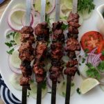 On a metal skewer,thread marinated beef (2 pieces) and beef fat (1 piece) alternatively and sprinkle tikka boti masala on skewers.