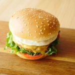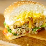 On burger bun,spread mayonnaise,add tomato,lettuce leaf,burger patty,caramelized onion,fried egg and cover with the top bun.