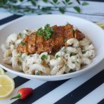 Serving plate mein pasta dal ker grilled chicken rakh dein aur fresh parsley sa garnish ker ka serve karein!