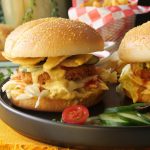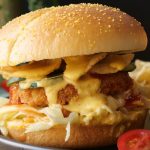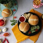 -Burger bun per tayyar jalapeno mayo sauce dal ker pheela lein,iceberg,cheese slice,fried veggie bureger patty,tomato ketchup,kheera,bakery chips aur tayyar jalapeno mayo sauce dal dein & burger bun sa cover ker lein (makes 4) & serve!