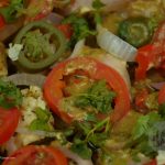 Now spread onion (round slices), tomato (slices), jalapenos and garlic (chopped).