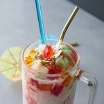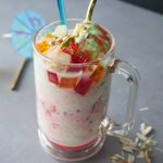 In serving glass,add falooda sev,basil seeds,lal sharbat,prepared rabri milk,yellow jelly,red jelly,pistachio ice cream scoop,falooda sev,basil seeds,pineapple chunks,red jelly,yellow jelly,lal sharbat,almonds, pistachios & serve!