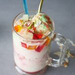 Serving glass mein falooda sev,tukh malanga,lal sharbat,tayyar rabri doodh,yellow jelly,red jelly,pista ice cream scoop,falooda sev,tukh malanga,pineapple chunks,red jelly,yellow jelly,lal sharbat,badam aur pista dal ker serve karein.