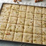 Ab isko greased tray main set karlen aur 1 hour rest kar len phir uper khopra, pista aur badaam sprinkle karke squares cut kar len.