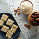Sprinkle desiccated coconut, pistachio and almonds and cut in squares.