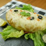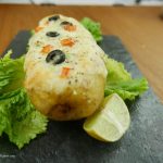Fill potato with salt, butter, mince chicken, green onion, tomatoes. Add cheese on top, garnish with olives, black pepper and bake for 20 minutes.